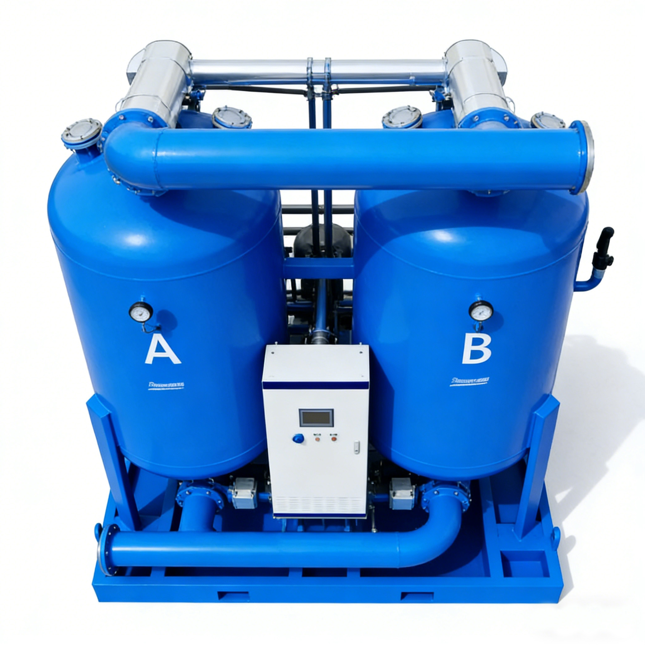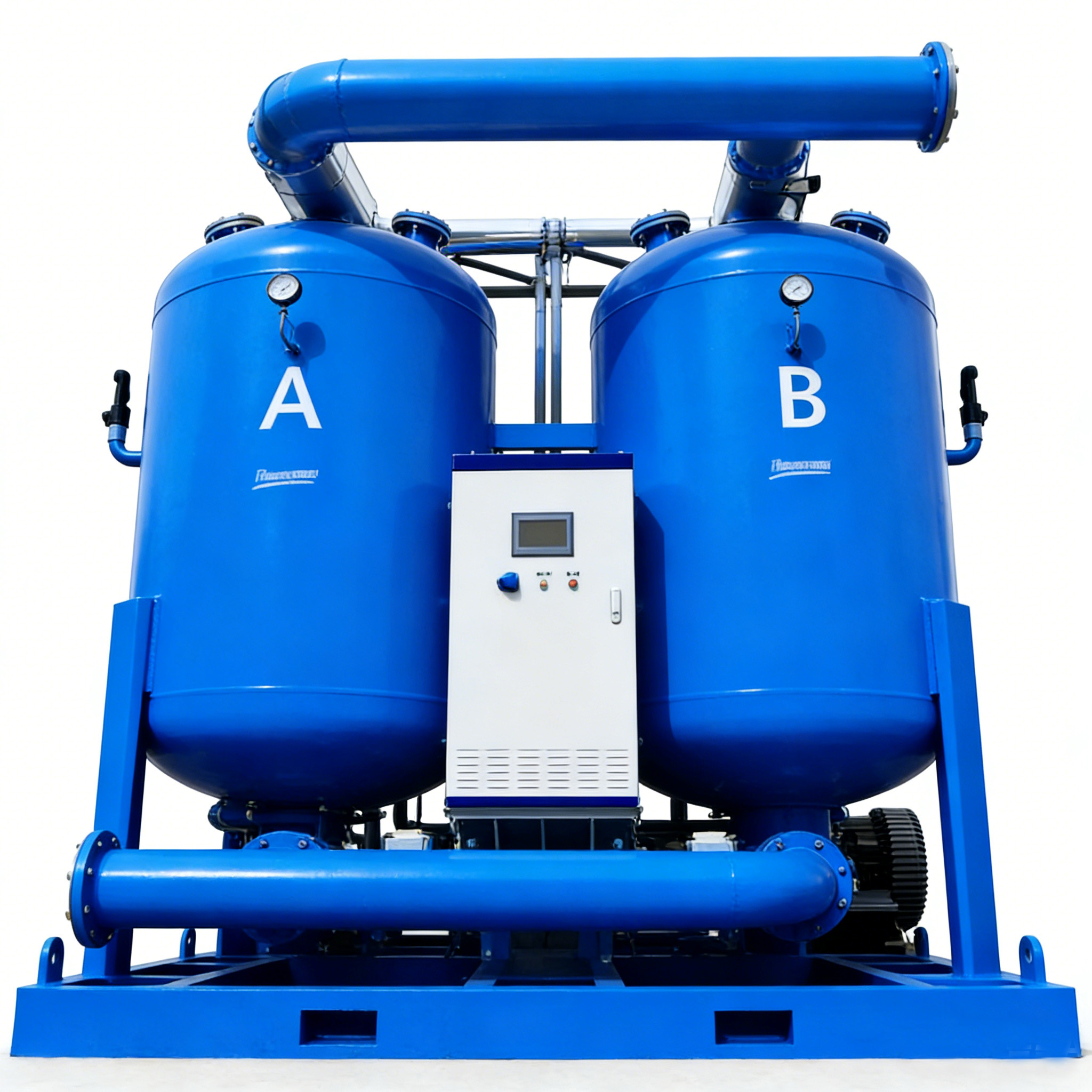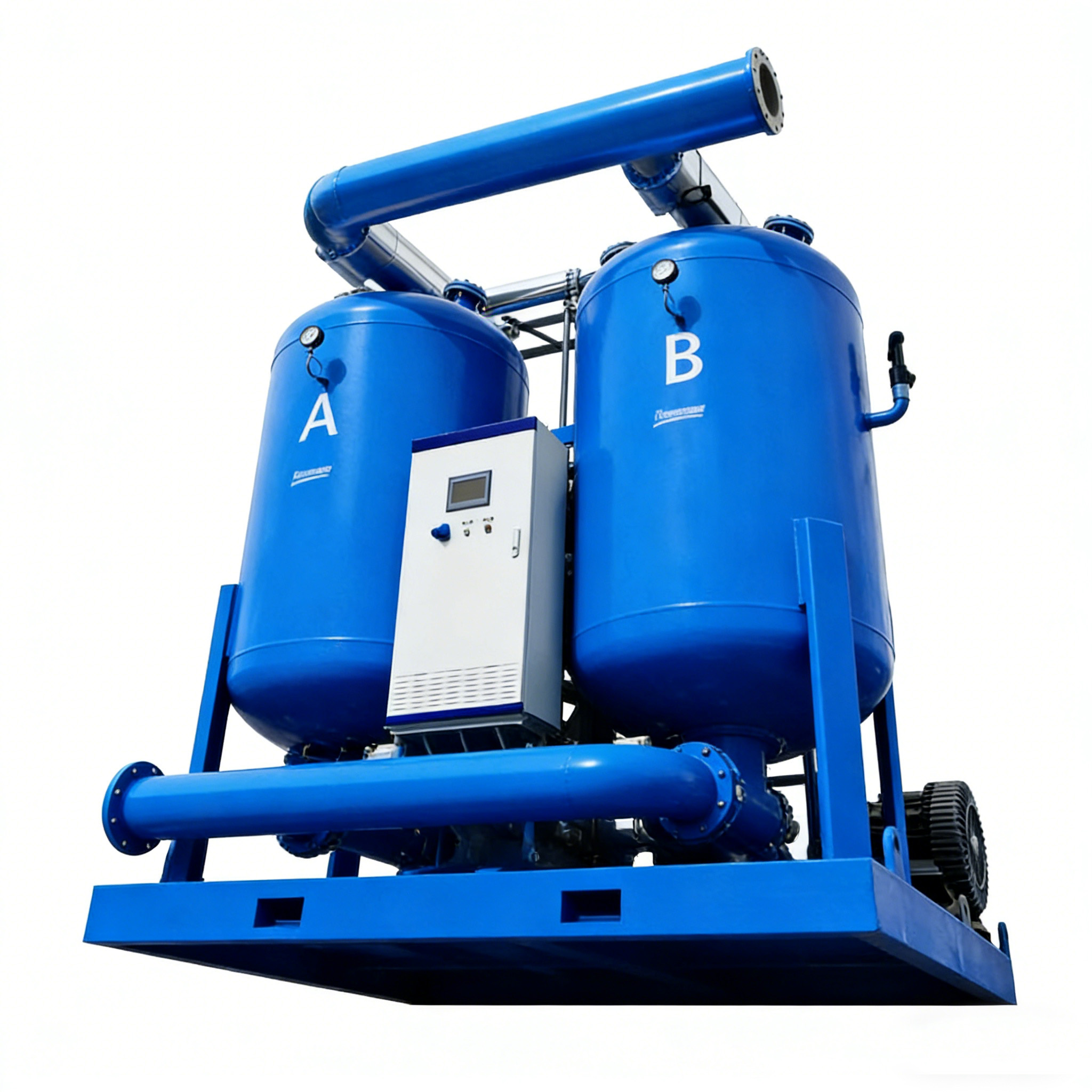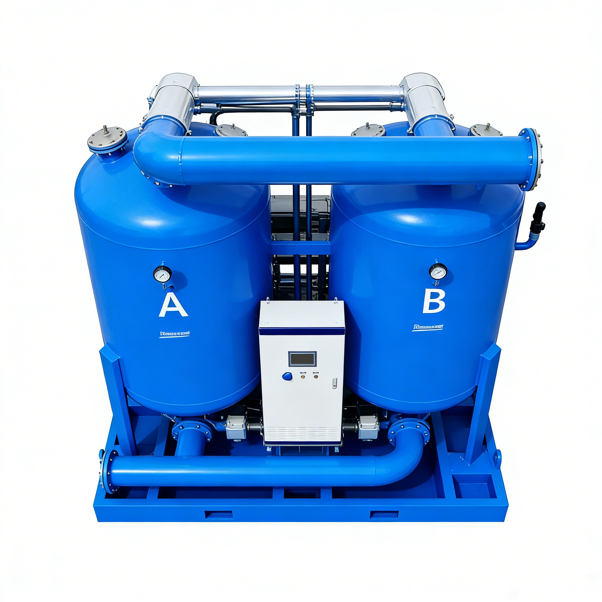 The Industrial Blower Zero-Loss Air Dryer is a high-efficiency compressed air purification device designed based on the principle of temperature and pressure swing adsorption. It features high-quality molecular sieve and activated alumina adsorbents, paired with a dual-tower alternating operation structure. The equipment achieves zero air consumption and zero heat consumption operation by utilizing the blower’s hot air regeneration technology, capable of deeply removing moisture from compressed air and delivering stable dew point clean and dry air. It effectively prevents issues such as pipeline corrosion and pneumatic component failures, providing reliable air supply assurance for industrial production and is widely adaptable to various high-demand industrial air source treatment scenarios.