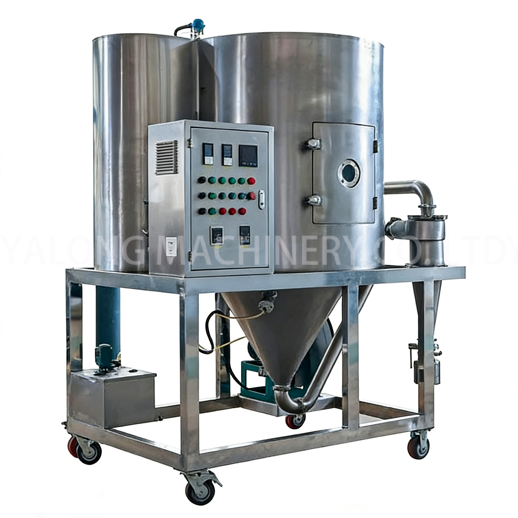 Centrifugal spray dryer is a highly efficient powder forming equipment, specially designed for the rapid drying of solutions, emulsions and suspensions, and is widely used in the fields of food, medicine, chemical engineering, new materials, etc. The equipment takes a high-speed centrifugal atomizer as its core, atomizing liquid materials into micron-sized fine droplets. These droplets fully contact with hot air, instantly completing water evaporation and directly obtaining uniform powder products. It adopts an intelligent temperature control system to precisely adjust the inlet and outlet air temperatures and air volumes, meeting the drying requirements of heat-sensitive and easily oxidized materials, and can retain the active components and original properties of the materials to the greatest extent. The equipment has a compact structure, a high degree of automation, and complies with GMP standards. It is easy to clean and maintain, making it an ideal choice for achieving large-scale and high-quality powder production.