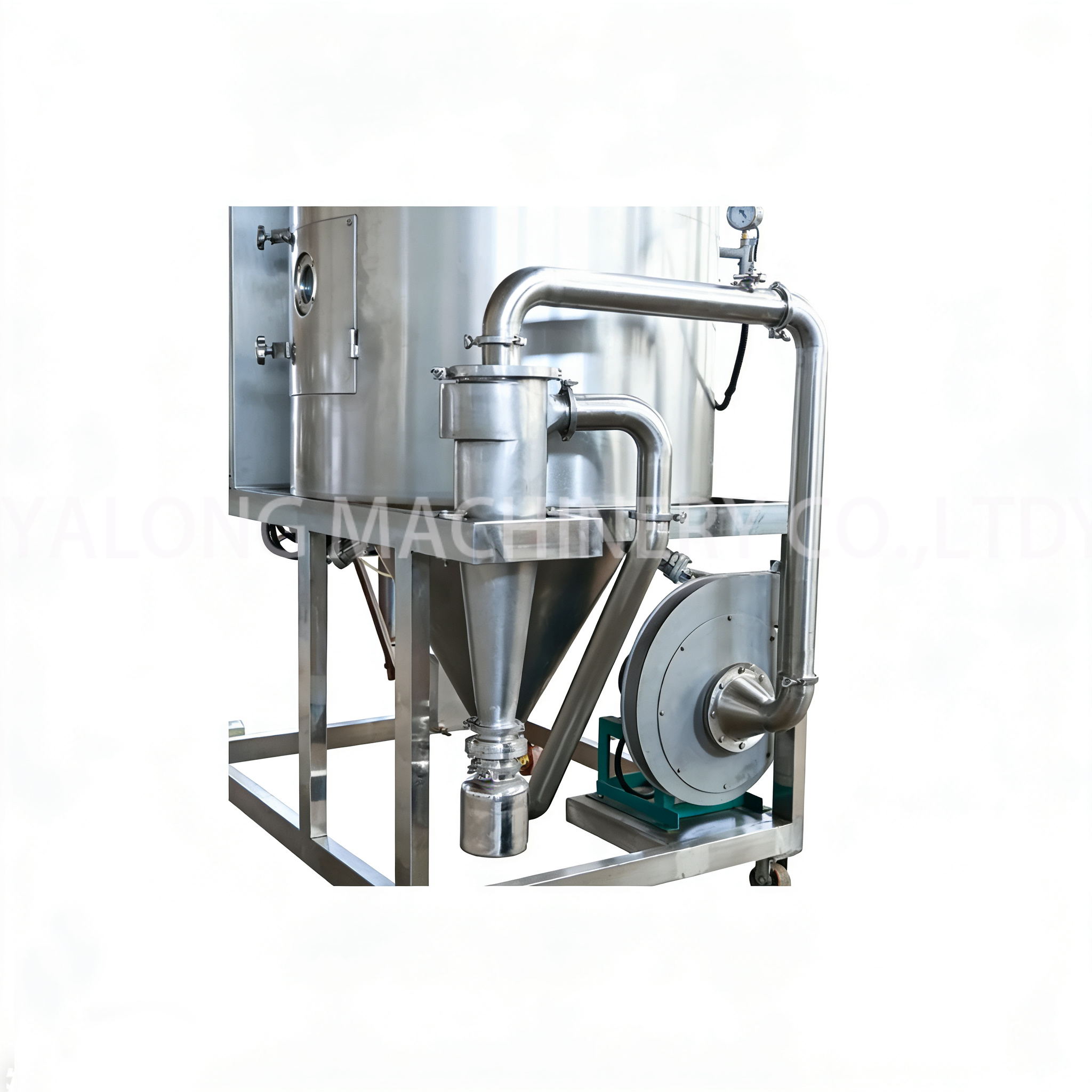 After being filtered and heated, the air enters the air distributor at the top of the dryer. Hot air enters the drying chamber in a uniform spiral shape. The liquid passes through a high-speed centrifugal atomizer (rotating) located at the top of the tower and is sprayed into extremely fine droplets, which come into parallel contact with hot air and can be dried into finished products in an extremely short time. The finished products are continuously discharged from the bottom of the drying tower through the cyclone separator, while the exhaust gas is discharged by the fan