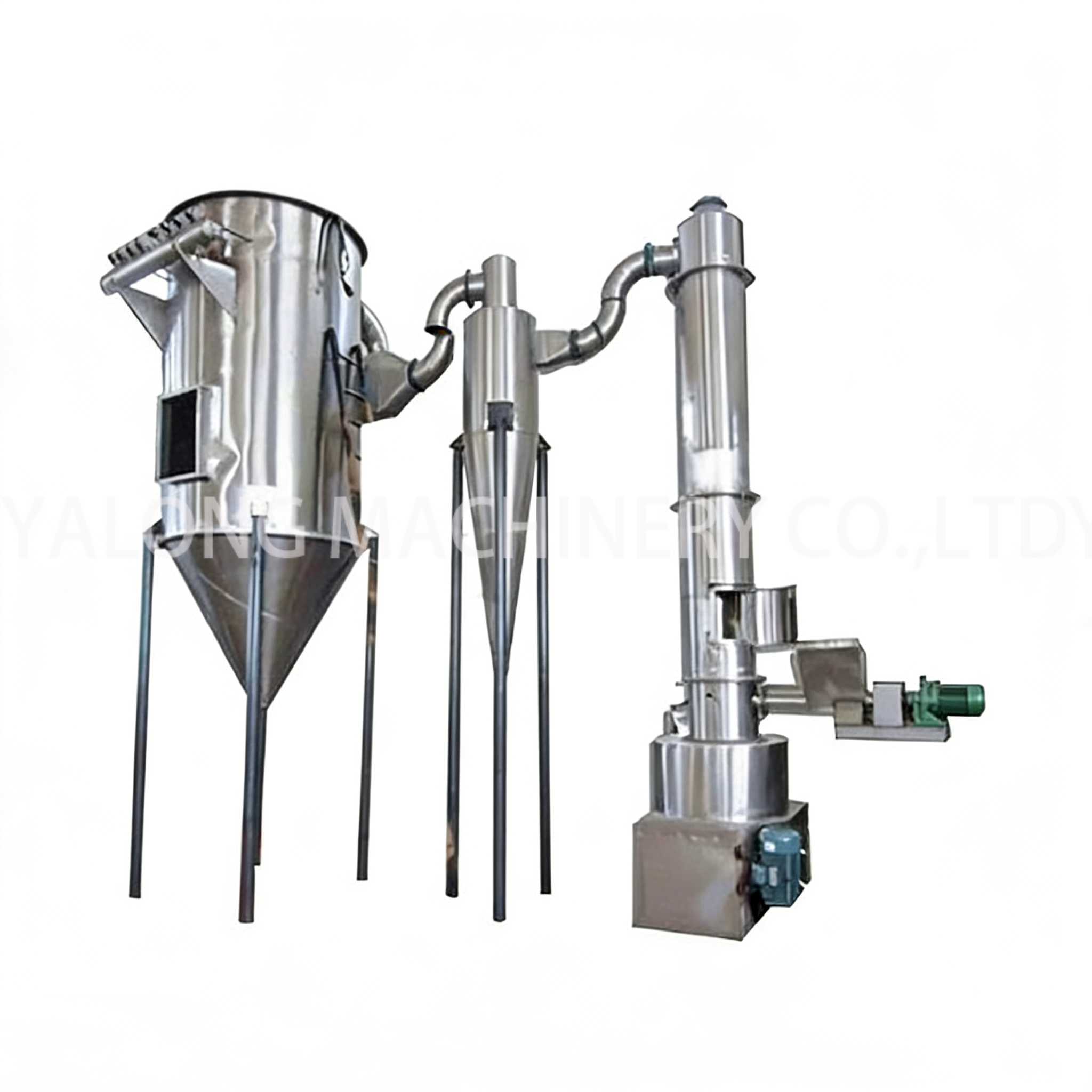 Hot air enters the bottom of the dryer along the tangential line and, driven by the agitator, forms a strong rotating air field. The pasty material is fed into the dryer by the screw feeder. Under the strong action of the high-speed rotating stirring blades, it is dispersed through impact, friction and shearing force. The blocky materials are rapidly crushed and come into full contact with hot air for heating and drying. The dehydrated and dried material rises with the hot air flow and the large particles are retained by the classification ring. Small particles are discharged from the center of the classification ring outside the dryer and recovered by the cyclone separator and dust collector. Undried or larger materials are thrown towards the wall under the action of centrifugal force and fall back to the bottom for crushing and drying. Applicable materials: organic substances, dyes, inorganic substances, food, etc.