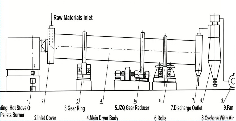 3. Energy-saving and consumption-reducing design: Equipped with a waste heat recovery device, it can recover and utilize the waste heat generated during the drying process, with a thermal efficiency of over 85%. By adopting variable frequency speed regulation technology, the rotational speed is automatically adjusted according to the moisture content of the materials, reducing energy consumption.