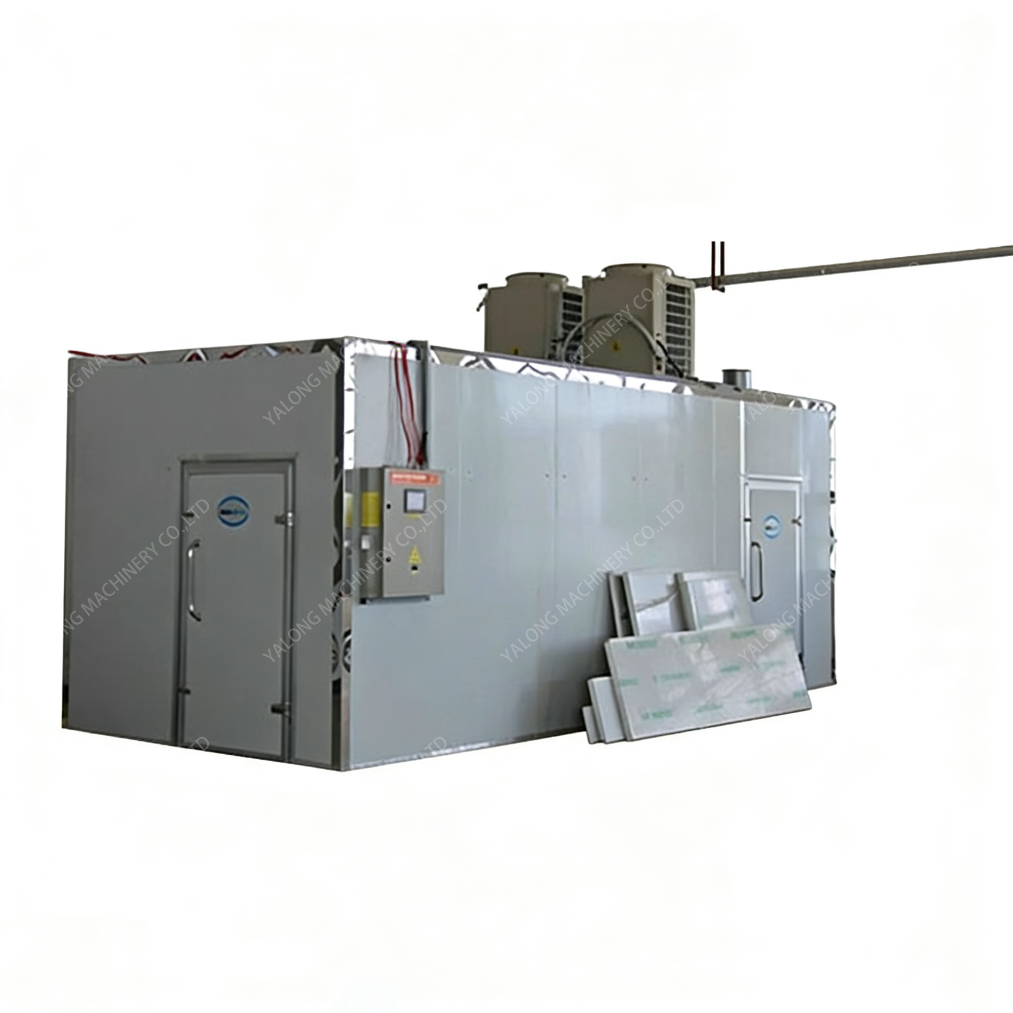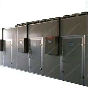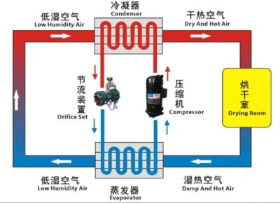 The heat pump unit is composed of main components such as a compressor, electronic expansion valve, drying filter, four-way valve, evaporator, condenser shell, and fan, and adopts the reverse Carnot principle. The compressor sucks in the refrigerant from the low-temperature and low-pressure air from the evaporator. After compression, the refrigerant is transformed into high-temperature and high-pressure air. The high-temperature and high-pressure air then enters the condenser to exchange heat with the air. Inside the condenser, it condenses into a low-temperature liquid and releases a large amount of heat. The material absorbs this released energy and takes away its moisture through the circulation of hot air, thereby achieving the purpose of drying the material.This equipment integrates a heat pump system, a fresh air system, a heat recovery system, a control system and a air circulation system. It is easy to install and maintain, has a lower price and higher energy efficiency
