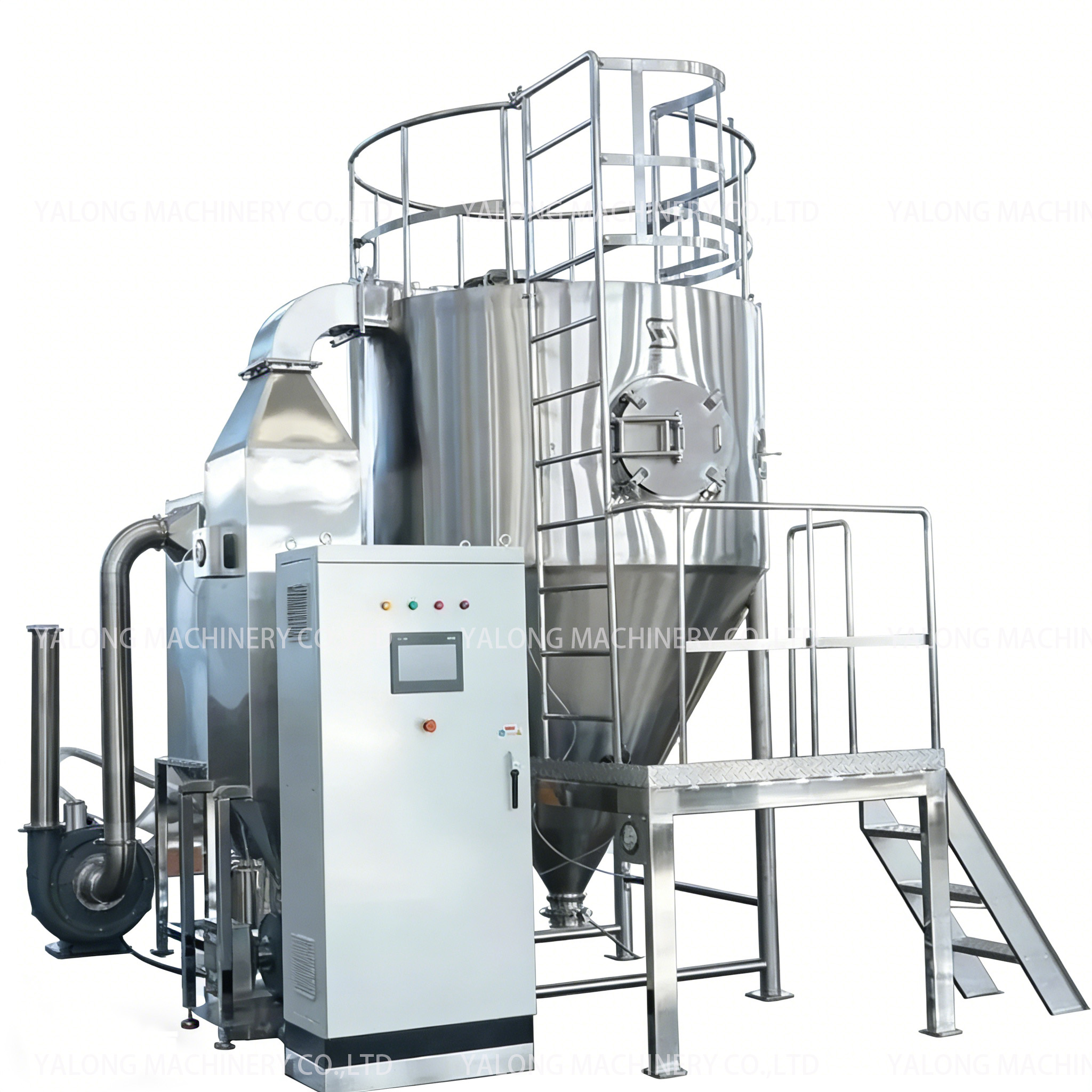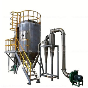 This machine adopts a fully sealed form, and all components are made of stainless steel. Equipped with three-stage filters, the filtration accuracy reaches grade 100,000. The interior of the cylinder is equipped with a wall cooling device to keep the temperature of the cylinder wall below 80℃. The drying tower is equipped with an air sweeping device inside. Even if the material remains on the cylinder wall, it will not burn or deteriorate, which greatly improves the powder collection rate and will not cause the drug to mix or stick to the wall.