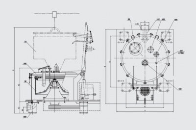 The platform structure of the L(P)D series bag-type centrifugal separator with upper discharge is that the shell and the flat plate are welded together. The shell cover and the shell adopt a flange connection quick-opening structure. The opening of the shell cover is assisted by a balance cylinder (spring). The shell cover is equipped with feeding pipes, cleaning pipes, sight glasses, observation lights, air vents, etc. The external connection ports all use standard baskets. The discharging method is that the shell cover is opened, and the filter bag is lifted as a whole through the cantilever to the drum for feeding.