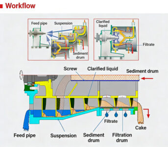 Most of the liquid is discharged through a variable overflow device on the back side of the centrifuge, and the clarified liquid is separated out.