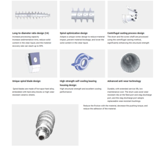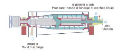 The materials enter through the feed pipe. Under the action of centrifugal force, the solid-phase materials deposit on the wall of the drum to form a sludge layer, while the liquid-phase materials form a liquid-phase ring. Starting from the drum wall, the solid-phase layer and the liquid-phase layer are successively formed inward. The screw continuously pushes the solid-phase materials deposited on the drum wall to the cone end of the drum, which are then discharged outside the machine through the discharge port. The liquid phase is discharged from the large end of the drum to the centrifugal pump.